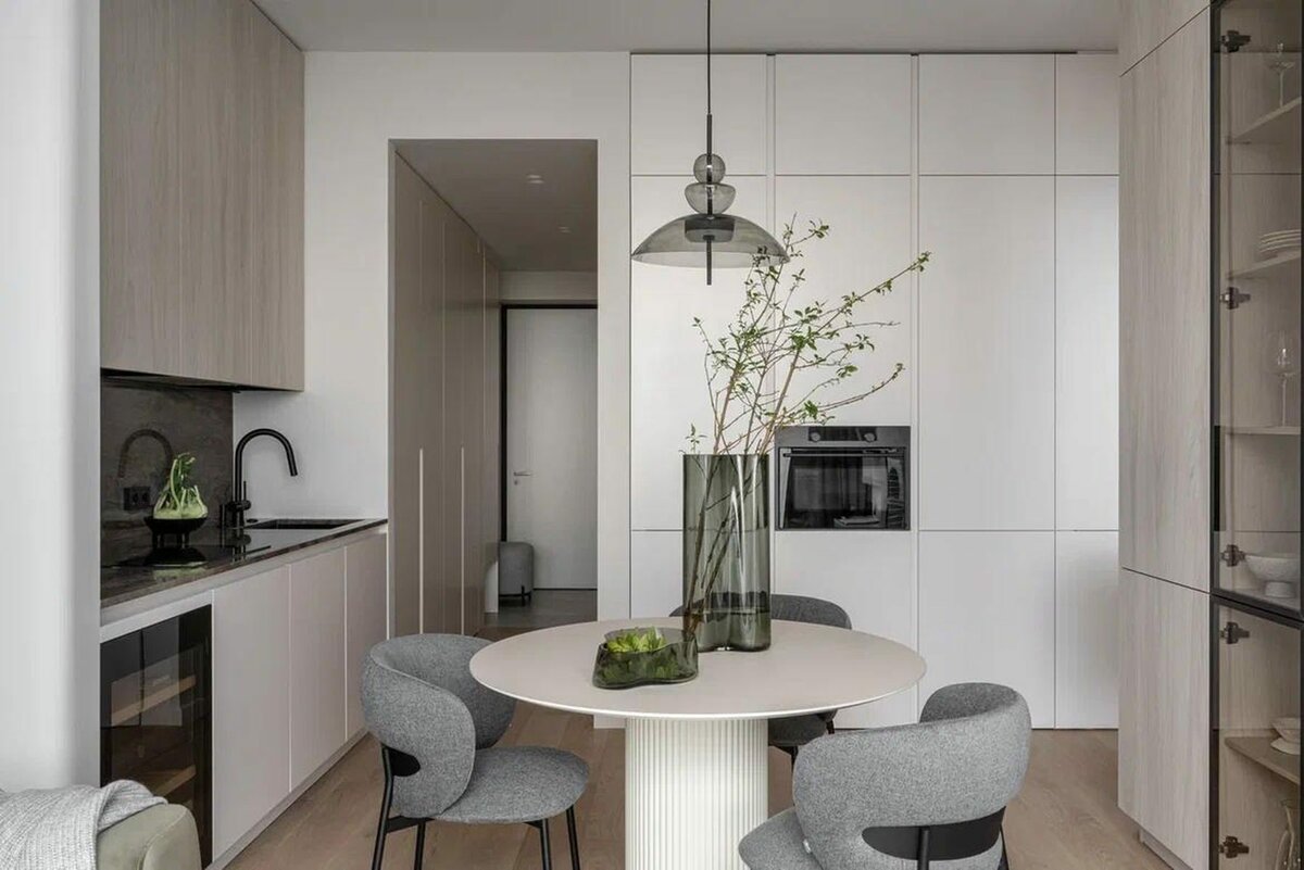 Кухня получилась именно такой, какой мы ее задумали: матовые фасады soft-touch цвета теплого бежа, столешница под светлый камень, интегрированные ручки и крепкая фурнитура с доводчиками. Встроенная техника идеально вписалась в проект — хорошо, что дизайнер нам это посоветовал. Холодильник и посудомоечная машина выглядят, как шкафчики — визуально это очень расширяет пространство.